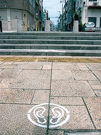 点音は鈴木さんがまちに長期滞在し、耳を澄ますのに良い場所を複数探し、マークをつけるイベント。96年のベルリンを皮切りにこれまで国内外50ヵ所で行い、和歌山は国内で初めての開催だった。七曲市場や市堀川の川べり、旧シネマプラザ築映近くの路地など中心市街地にマークを付け、今も半分ほどが消えかかりつつ残っている。
