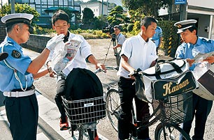 新制度は、信号無視や一時不停止、酒酔い運転、ブレーキ不良自転車運転などを危険行為に規定。傘差し運転や携帯電話を使いながらの運転も、安全運転義務違反として摘発の対象となる。3年以内に2回摘発されると手数料5700円を払って3時間の講習を受けなければならず、命令に反した場合は5万円以下の罰金が科される。