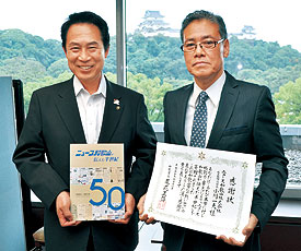 ニュース和歌山は6月11日、創刊50周年を記念した冊子『ニュース和歌山が伝えた半世紀』150冊を和歌山市に寄贈した。小川一夫社長は「読者に支えられて迎えることができた50年。和歌山の歴史をつむいできた人たちの足跡を振り返り、これからの街をどうしていくのかを考えるきっかけにしてほしい」と話している。