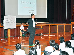 東日本大震災時、大阪市が被災地に派遣した緊急消防隊の隊長を務めた木村忠彦さんが6月16日、和歌山市吹上の和歌山大学附属中学校で講演した。木村さんは「30年以内に70%の確率で南海トラフ地震が起こると言われている。避難訓練をしっかり行い、いざという時に命を守ってほしい」と生徒419人に訴えた。