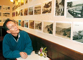 写真=昔の街並が写った絵ハガキを眺める店主の木村さん