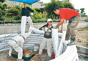 左官業を営む小川社長は以前から、東南海・南海地震への危機感を持っていた。そんな時、知人から聞いたのがアースバッグハウスで、長い筒状の特別な土のうを積み上げ、ドーム状に造り上げる工法は地震や風水害に強く、災害が多い日本で有効と考え、自社の敷地内に造ることにした。
