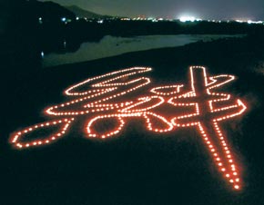 当日はろうそくの火を使い、河原に漢字を浮かび上がらせる。これまでは〝祈〟〝命〟のほか、竹房に阿字岩と呼ばれる弘法大師ゆかりの岩があることから、〝空〟〝海〟を選んだ年も。今年はろうそく700本で〝法〟を点灯させる。