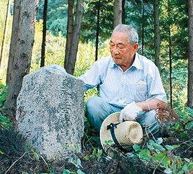 写真=空爆で上部だけ残った石碑は今も山中にある