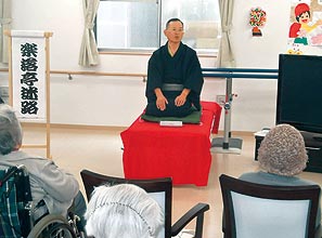 老人ホームや敬老会への慰問(写真)や、外出が難しい高齢者の自宅で落語を披露する「訪問寄席」など、笑いを介護の現場に届ける同会。落語家の笑福亭学光さんが創設した資格「お笑い福祉士」の講座を開き、これまで会員10人以上が取得している。