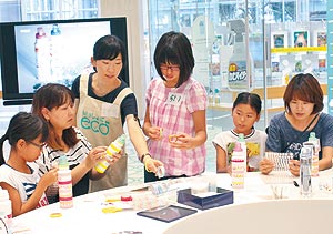 地球環境について一緒に考えようと、和歌山市湊の花王は8月25日、花王エコラボミュージアム見学と工作のワークショップを初めて開いた。小学4~6年と保護者21組が参加。花王コーポレートコミュニケーション部門の佐野洋子さんは「親子で1日どっぷりエコにつかってもらおうと企画しました。材料が足りなくなるほどたくさんの個性とアイデアあふれる作品を、皆さんが熱心に作ってくれた」と喜んでいた。