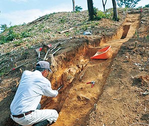 写真=古墳の断面から、階段状に土を積む段築を確認した
