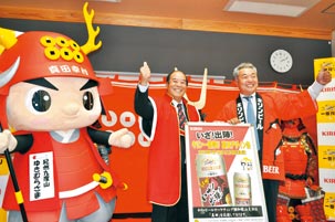 10月8日には岡本章九度山町長とキリンビールマーケティングの伊村正明和歌山支社長が同町の道の駅「柿の郷くどやま」を訪れ、デザインを披露(写真)。同社は「すでに反響があり、真田丸への関心の高さを感じます。ぜひ大河ドラマを見ながら、デザイン缶を片手に楽しんでもらいたい」と期待する。