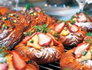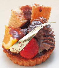 出展するのは、リュミエール・デ・ラァムール(クレープ)、藤桃庵(ジェラート)、カフェ日和(シフォンケーキ)、紫香庵(和菓子)、ブーランジェリー・フルリール(パン)、アンブローシア(洋菓子)、綿菓子屋きりんの県内7店。アンブローシアはチョコタルトにいちごやオレンジ、バウムクーヘンなどをのせたフェスタ限定菓子(写真下)を、藤桃庵は桃、みかんほか地元産果物を使ったジェラートに加え、新メニューのホットチョコレートを初披露する。