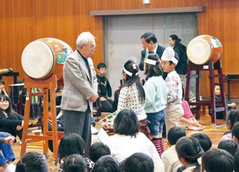登下校時の見守り活動をする和歌山市木本地区の地域安全推進員会や北署に感謝の気持ちを伝える「ありがとうフェスティバル」が11月27日、同市榎原の木本小学校で開かれた。小学2年と6年が合唱や太鼓を披露した。尾形兼資校長は「雨の日も雪の日もどんな時でも児童の安全を見守ってくれ、ありがたい」と話した。