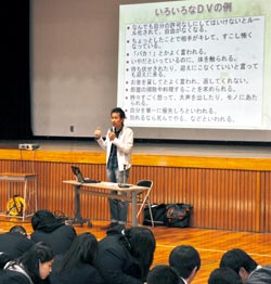 交際相手との間で起きる暴力、いわゆるデートDV(ドメスティックバイオレンス)についての正しい知識を持ってもらおうと、県男女共同参画センターは11月24日、和歌山市森小手穂の和歌山東高校で出前講座「イマドキ高校生のリアル恋愛論」を開いた。講師を務めた立命館大学非常勤講師の伊田広行さんは「デートDVが高校生活で起こりうるし、これから身近な問題になる。対等な恋愛関係を知ってほしい」と呼びかけた。