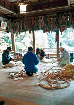 海南市小野田にある宇賀部神社で毎年恒例となっているしめ縄作りがおこなわれました。紅葉したもみじのもと、氏子たちが大勢集まって手際よくしめ縄を作っていました。
