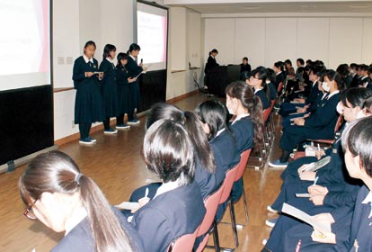 女性の社会進出が抱える問題とその解決策を、和歌山信愛高校(和歌山市屋形町)2年生が12月11日、和歌山労働局や、働く女性を支援する「女性と地域活性推進機構」の職員らを前に同校で発表した。文部科学省が行うSGH(スーパーグローバルハイスクール)アソシエイト研究プログラムの一環。B組の樋上まこさんは「自分で課題を発見するのが大変だった。少子高齢化、孤独死が問題になっているので、地域のつながりを大切にした解決策を提案しました」と笑顔を見せていた。