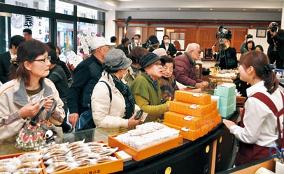 昨年6月に9億円の負債を抱えて倒産した和菓子店、駿河屋。創業550年の歴史を絶えさせまいと、創業家出身の岡本良太社長ら有志が新会社「総本家駿河屋」を立ち上げ、3月24日、10ヵ月ぶりに和歌山市駿河町の本店にのれんが掛かった。初日は長年のファンら約200人が店外まで行列をなし、名物の本ノ字饅頭やようかんを買い求めた。以前より販売品目を減らしつつ、生菓子を中心に新商品を次々に打ちだし、4月に高松店、10月に海南店、11月に岩出店も営業を再開した。