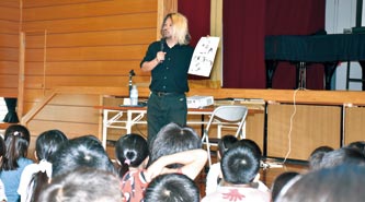 続いて、アニメ作りの現場で登場人物の服の色をどう決めたか、宣伝ポスターはどんなイメージかのほか、トトロや人を乗せて走るネコバスの中や、村の地図を作ったことを紹介した。作品の舞台は緑がいっぱいの村。「安原小学校の辺りはトトロがいるような場所がたくさん。アニメを見た後は、山でトトロを探して」と呼びかけた。
