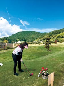 宿泊客や地域住民らの健康づくりにと標高450㍍の敷地内に整備したゴルフ場は、5500平方㍍で9ホールある。専用クラブ1本を使ってカップに入るまでの打数を競う。ゴルフ経験者は30~40分、未経験者も40~45分で回れる。