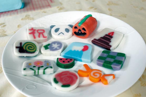 デコもちは、だんご粉と砂糖を練った生地に、ココアやチョコレート、食紅などで色をつけ、棒状に細長くまとめる。これらを組み合わせて図柄を作り、かまぼこ型や丸型に整える。「スイカや富士山、市松模様にバラ…。組み合わせ次第で好きな柄が表現できます。切る時のわくわく感がデコもちならではのおもしろさ。うどんやお鍋、デザートのトッピングにしても映えます」