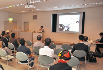 講師は和大経済学部長の足立基浩教授、観光学部の永瀬節治准教授。永瀬准教授は市駅前通りを歩行者天国にした社会実験を語り、「まちは従来の『つくる』だけでなく『育てる』時代。施設や拠点をどう生かし、地域を再生させるかのビジョンを持つべき」と話しました(写真)。