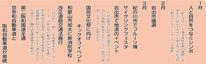 第二阪和国道が全通し、京奈和自動車道が阪和自動車道に接続する2017年。大阪や奈良方面への外出が便利になる一方、地元和歌山では紀の川市でフルーツ、海南市で菓子をテーマにした催しが開かれます。教育分野では県内公立学校初の小中一貫校となる伏虎義務教育学校が開校します。