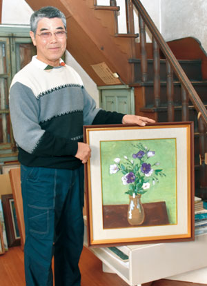 写真=幸子さんが描いた花の絵に手をかける一彦さん