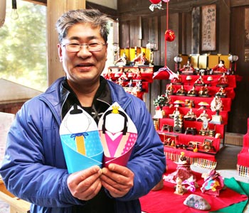 「紀州海南ひなめぐり」開催中の海南市。150ヵ所近くある会場の一つ、大野中の春日神社はオリジナルの紙製おひなさまを配付している。