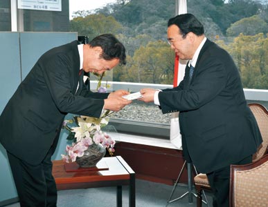 写真=CDを尾花市長(左)に手渡す澤さん