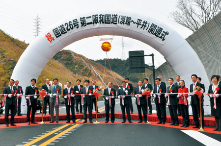 事業は、和歌山市と堺市を結ぶ国道26号のバイパスとして1963年にスタートし、50年余りかけての全線開通。和歌山市大谷~阪南市自然田間は暫定2車線で、4車線化は開通後の交通状況から判断する。孝子ランプは秋ごろ開設の見込み。