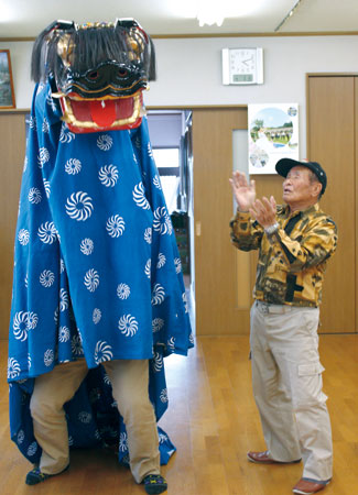 復活以降、かつて経験したことのある70代以上が中心となって獅子頭を担当していたが、一昨年からは青年2人が力強く披露している。その一人、専門学校生の谷口智大さんは「動きが大きいので人に当たらないよう気をつけています。お客さんが驚いたり、笑ったりしてくれるのがやりがい」。4月1日の練習では、これまではしていなかった肩車の大技「高うなれ低うなれ」に初めて成功。急きょ、今年の演目に組み込むことにした。これで8つある舞のうち、5つの再演が実現する。