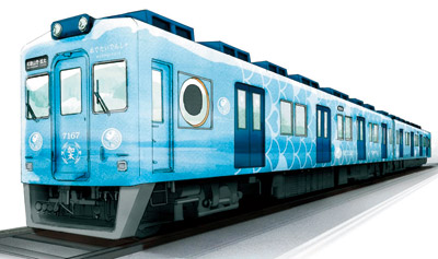 水色のタイが泳ぎ出す!? 南海電鉄は10月7日(土)、和歌山市駅〜加太駅間を走る観光列車「めでたいでんしゃ」の水色バージョンをデビューさせる。