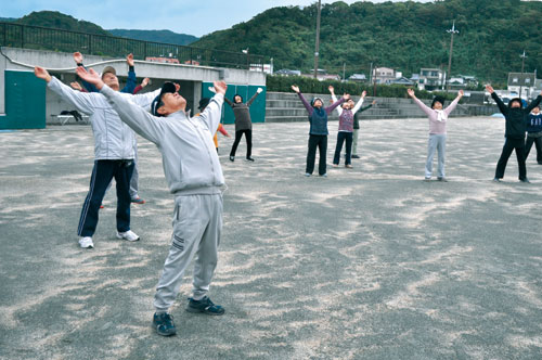 自治会でウォーキングとラジオ体操に取り組む和歌山市加太地区では、毎朝約30人が集まる。参加者からは「手足が軽くなった」「よく眠れるようになった」との声が。会を引っ張る佐地一豊さんは「全員の歩数を足して距離換算し、日本一周を目指しています。メンバーのやりがいにつながっています」とにっこり。