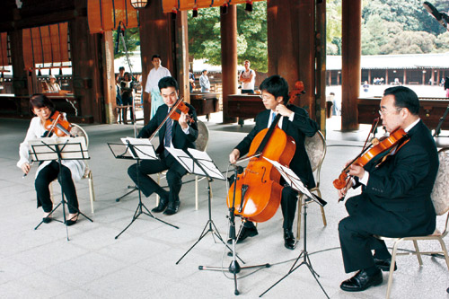 写真=2014年、明治神宮で津波ヴァイオリンを奉納演奏する澤和樹学長(右端)、中澤きみ子さん(左端)ら