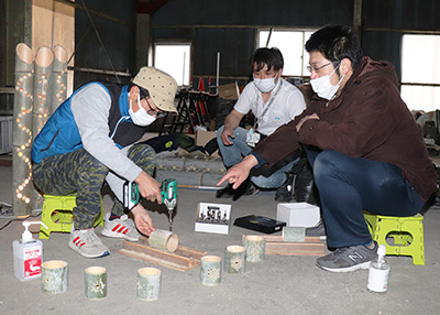 写真=竹あかりを製作する藪下さん(左)と谷さん(奥)