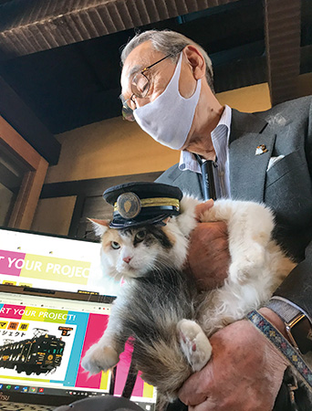 写真上=クラウドファンディングスタートのスイッチを押すニタマ駅長(和歌山電鐵提供)