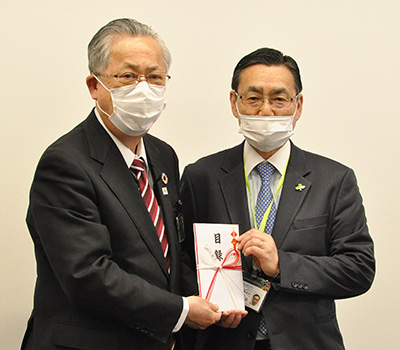 2月、同社社員の子どもが小学校に持参して使ったところ、好評だったのを受け、寄贈を申し出た。山崎雅史専務(写真右)は「石けんと一緒に使い、元気に過ごしてほしい」と願っていた。