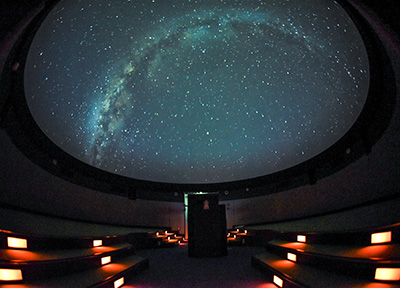 新しく設けたプラネタリウム棟は、直径約8㍍のスクリーンに、星の映像や、天文台から見られる空の様子を流す。床にじゅうたんを敷き、座ったり、寝転がったりしながら見られる。敷地南側の広場「空の庭」に設けた45×6㍍の展望デッキでは、星の観測会を行う。