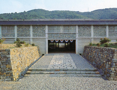 建物の背後に古墳群の山が隠れないよう低く建てられ、駐車場から館まで歩く構造は、万博記念公園と同じ。大阪万博の会場を基本設計した西山の考えが反映されていて、同館学芸員の田中元浩さんは「モータリゼーションに偏らず歩くことで人間らしさを回復する考えがある。こういう西山の構想を、強く浦辺が進めました」。