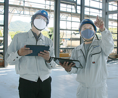 写真=工事現場でタブレット端末を手に打ち合わせする和田さん(左)と岡﨑さん