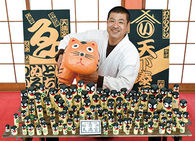 写真=張り子の寅を抱え、手水舎を飾るうそどりに囲まれる小板さん
