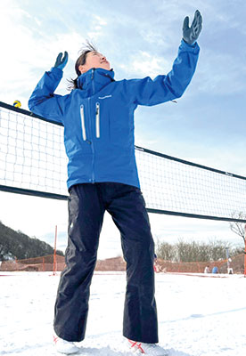 冬季オリンピック種目を目指し、国際バレーボール連盟が2019年に始めた新スポーツ。3人制で、足元が不安定な反面、滑りやすさを生かした迫力あるスライディングレシーブが魅力だ。スノーボード用のウェアに手袋、サッカーシューズを身につけ競技する。