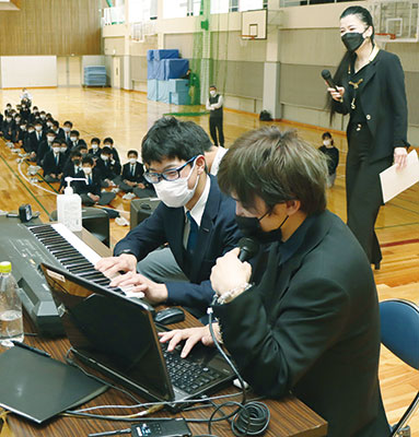 イケハラさんは「SDGsには幅広い課題が網羅されており、様々な分野の知識を横断的につける必要がある。今回、新たな発想を生む経験をと楽曲制作の一端を経験してもらいました。この特異な体験が生徒たちの活力につながれば」と期待していた。