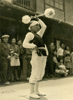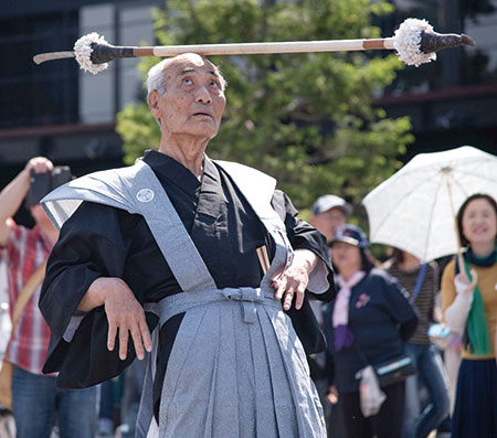 畑中さんは、戦争で和歌祭が中断された1938年生まれ。戦後、祖父の楠五郎さんが薙刀振の責任者を務めていたことから、近所の仲間と一緒に始めた。「学校から帰ってきた後、明光通りにあるお寺で暗くなるまで練習したのを覚えています」。初めて迎えた本番では、得意の頭回しを披露。「今も昔もこの技ができるのは私ぐらいです。観客から『目の前でやってくれ』との意味の合図〝ショモショモ〟と声をかけられましたね」