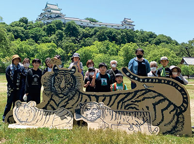 大きな段ボールに黒い絵の具でダイナミックに描かれた虎が、和歌山城観光バス駐車場西側の芝生広場にズラリと並び、訪れた人を驚かせている。