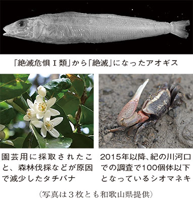 絶滅の危機にひんしている「絶滅危惧(きぐ)Ⅰ類」も92種増え506種に。以前は紀の川や有田川ほかにいたシオマネキや、ミカンの原種、タチバナなどが含まれる。
