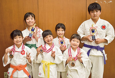 日本拳法全国少年大会が4月16日、大阪の門真スポーツセンターで開かれ、海南拳友会に所属する亀川小1年の水越杏さん(写真右から2人目)が、小1女子の部で優勝。同時に、団体低学年の部でも3位と、好成績を残した。