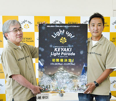 写真=けやきライトパレードのポスターを掲げる古澤実行委員長(右)と大越康臣副委員長