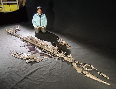 尾を除く全身の骨格化石がほぼすべて保存されているモササウルス類の化石は、国内だけでなく世界的にも例が少ない。小原課長は「これまでのモササウルスとの違いを実感してもらえるよう、館内に複製を展示しています」と話している。