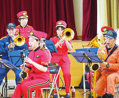 4年ほど前から、より興味を持ってもらおうと隊のあり方を試行錯誤。曲と講話に加え、演奏用の制服以外に活動服や救急服などの着用を増やし、防火に関する劇を披露したり、はしご車を駆け上がって放水したりと、〝消防らしさ〟を前面に出している。