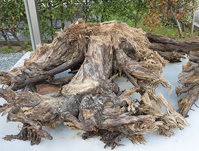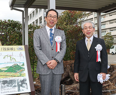 江戸時代、紀州東照宮へと通じる道沿いに整備された松並木の伐採根3点が和歌山市西高松の和歌山大学松下会館北側に保存展示され、1月26日に披露式が開かれた。和歌浦松並木顕彰会共同代表の藤本清二郎和大名誉教授は「江戸時代からある松並木跡の伐採根出土で、かつての街道は道幅約5・5㍍だったと推定できるなど、文化的、歴史的に貴重。地域遺産として長く守り続けられる」と喜んでいる。