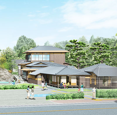 玉津島神社に隣接する旧福島嘉六郎邸を改修するもので、すでにトイレと駐車場は完成。現在は9月開館に向け、母屋と離れ、庭園、施設横の奠供山(てんぐやま)に登る山道を整備している。母屋は外観を修復し、庭園と一体的に保存。離れは体験・交流や休憩スペースとする。
