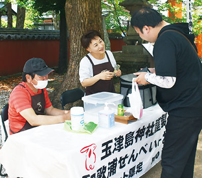 「参拝客が一息つけるように」と和歌山市和歌浦中の玉津島神社で毎週日曜、地元住民が協力し和歌浦せんべいと抹茶のセットを販売している。